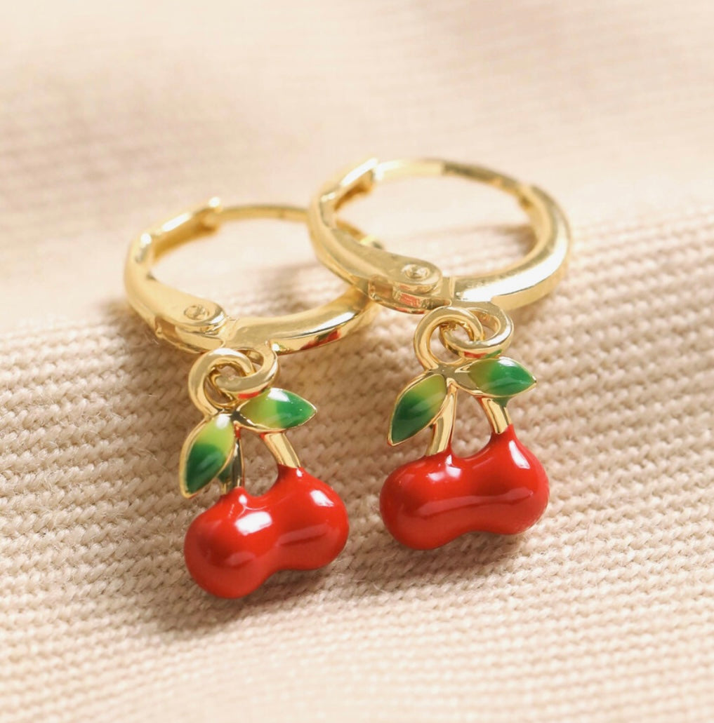 These irresistible huggie hoops are the perfect fruit-themed accessory. Featuring tiny red enamel cherries dangling from each polished hoop these are perfect for anyone with multiple piercings . Fastens with a classic hinge .